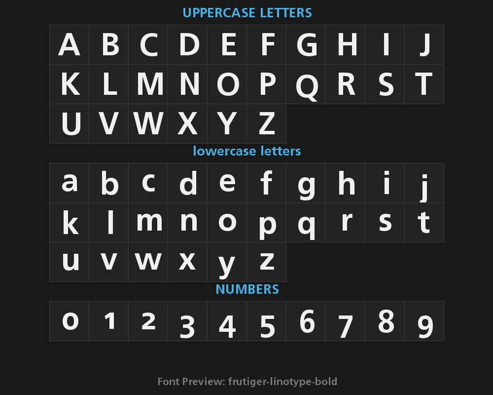 frutiger-linotype-bold is a font file with a size of 0.10 MB. The full font name is Frutiger Linotype Bold, Version 1.10 version. It contains 536 characters, supports 8 Chinese characters. The copyright belongs to Frutiger Linotype. frutiger-linotype-bold font is available for free download, but commercial use requires confirmation on the Frutiger Linotype official website whether it's free for commercial use.