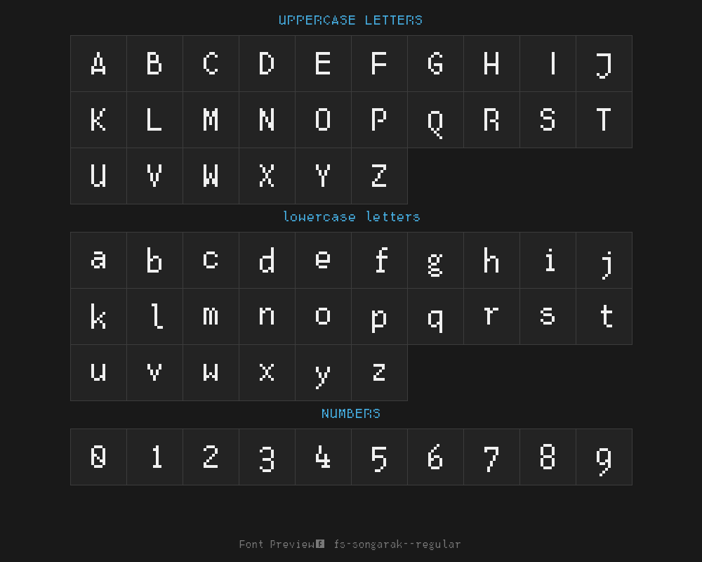 fs-songarak-1-regular is a font file with a size of 0.37 MB. The full font name is fs songarak 1 Regular, Version 1.0 version. It contains 2518 characters, supports 8 Chinese characters. The copyright belongs to fs songarak 1. fs-songarak-1-regular font is available for free download, but commercial use requires confirmation on the fs songarak 1 official website whether it's free for commercial use.