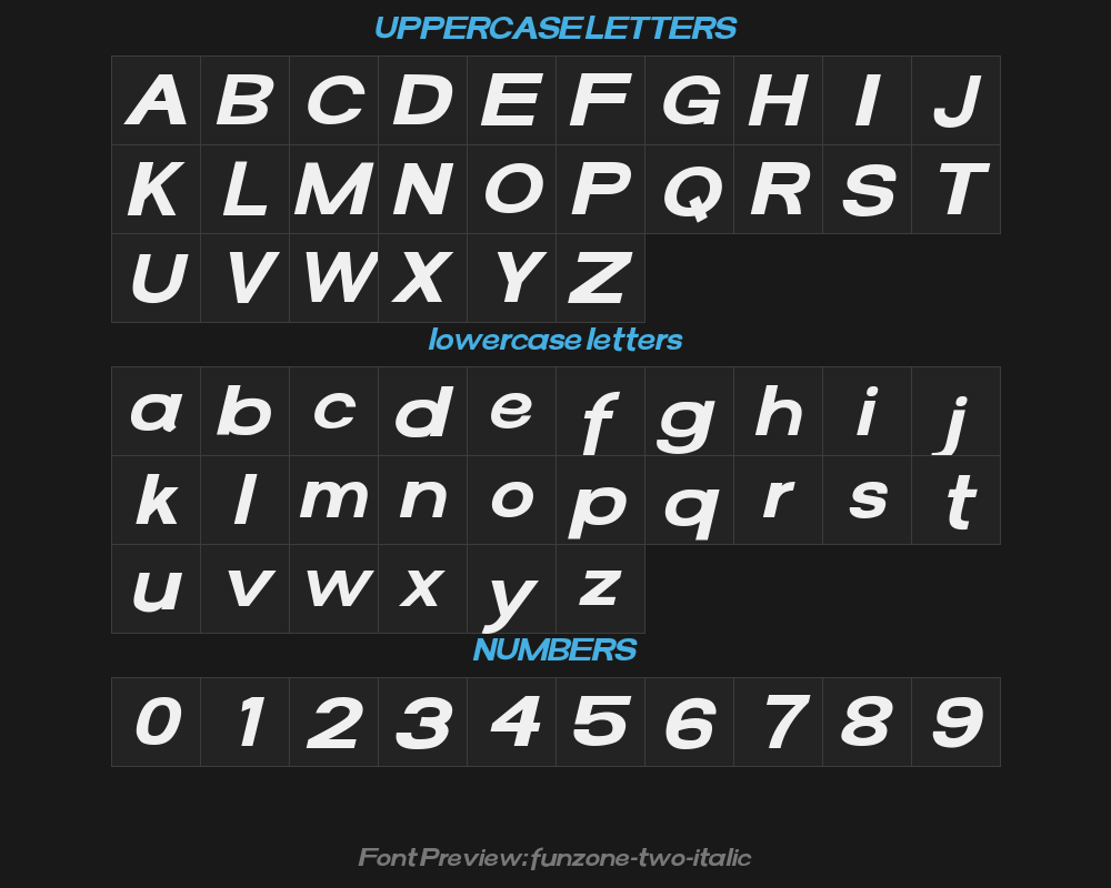 funzone-two-italic is a font file with a size of 0.02 MB. The full font name is FunZone Two Italic, Version 1.00 August 15, 2015, initial release version. It contains 213 characters, supports 8 Chinese characters. The copyright belongs to FunZone Two. funzone-two-italic font is available for free download, but commercial use requires confirmation on the FunZone Two official website whether it's free for commercial use.