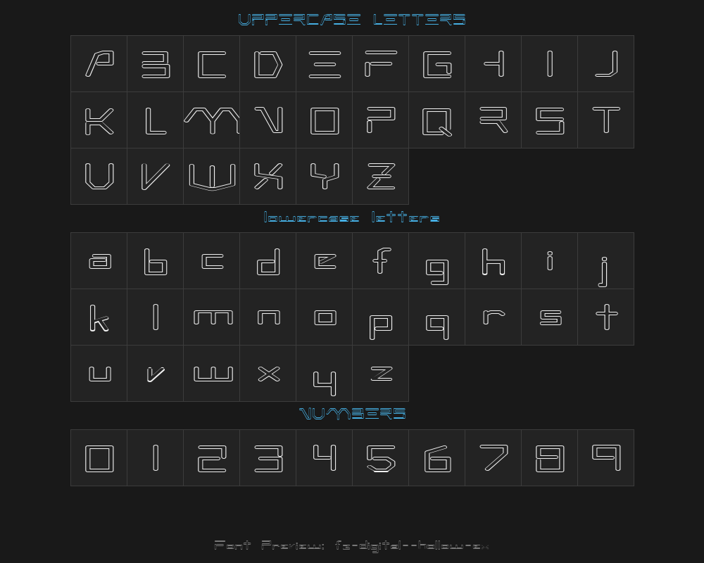 fz-digital-7-hollow-ex is a font file with a size of 0.09 MB. The full font name is FZ DIGITAL 7 HOLLOW EX, 1.000 version. It contains 207 characters, supports 8 Chinese characters. The copyright belongs to FZ DIGITAL 7 HOLLOW EX. fz-digital-7-hollow-ex font is available for free download, but commercial use requires confirmation on the FZ DIGITAL 7 HOLLOW EX official website whether it's free for commercial use.