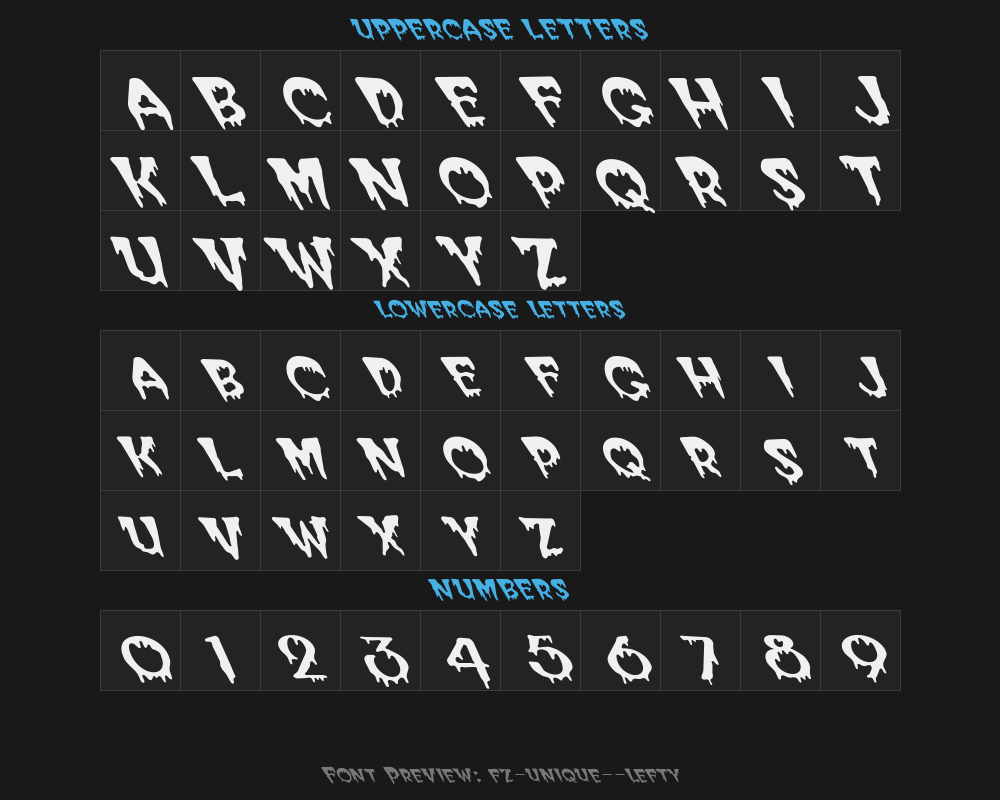 fz-unique-10-lefty is a font file with a size of 0.08 MB. The full font name is FZ UNIQUE 10 LEFTY, 1.000 version. It contains 199 characters, supports 8 Chinese characters. The copyright belongs to FZ UNIQUE 10 LEFTY. fz-unique-10-lefty font is available for free download, but commercial use requires confirmation on the FZ UNIQUE 10 LEFTY official website whether it's free for commercial use.