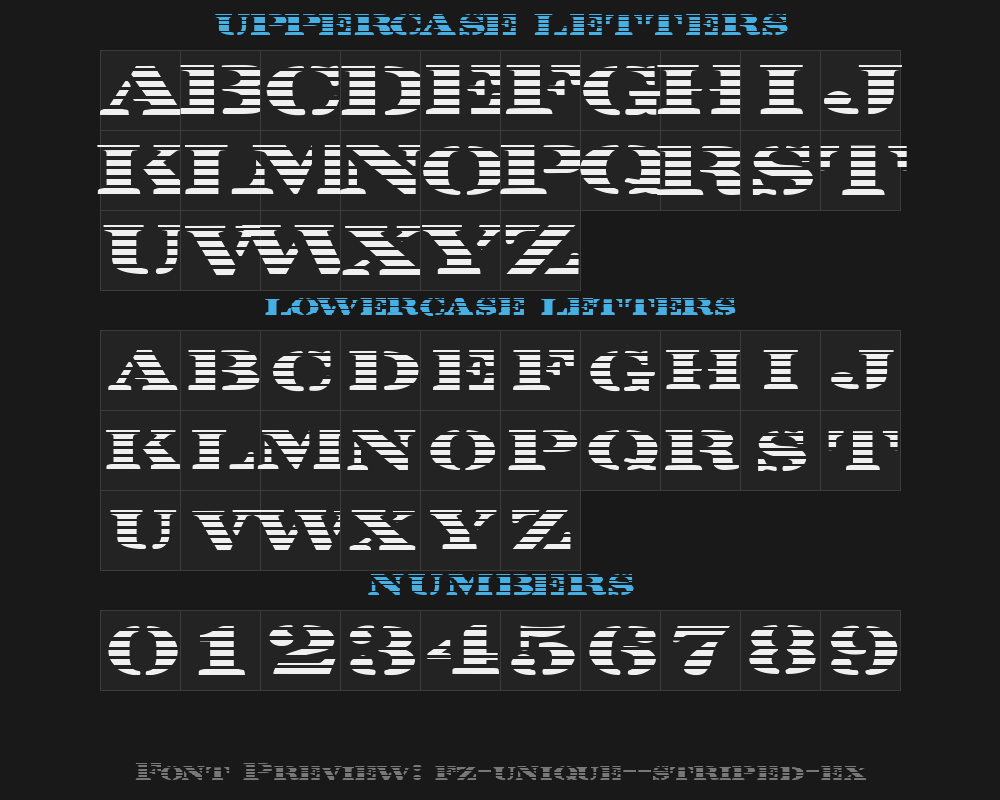 fz-unique-25-striped-ex is a font file with a size of 0.09 MB. The full font name is FZ UNIQUE 25 STRIPED EX, 1.000 version. It contains 171 characters, supports 8 Chinese characters. The copyright belongs to FZ UNIQUE 25 STRIPED EX. fz-unique-25-striped-ex font is available for free download, but commercial use requires confirmation on the FZ UNIQUE 25 STRIPED EX official website whether it's free for commercial use.