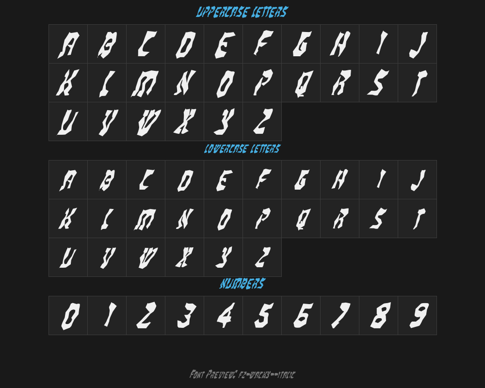 fz-wacky-20-italic is a font file with a size of 0.06 MB. The full font name is FZ WACKY 20 ITALIC, 1.000 version. It contains 169 characters, supports 8 Chinese characters. The copyright belongs to FZ WACKY 20 ITALIC. fz-wacky-20-italic font is available for free download, but commercial use requires confirmation on the FZ WACKY 20 ITALIC official website whether it's free for commercial use.