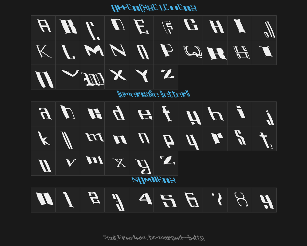 fz-warped-16-lefty is a font file with a size of 0.07 MB. The full font name is FZ WARPED 16 LEFTY, 1.000 version. It contains 182 characters, supports 8 Chinese characters. The copyright belongs to FZ WARPED 16 LEFTY. fz-warped-16-lefty font is available for free download, but commercial use requires confirmation on the FZ WARPED 16 LEFTY official website whether it's free for commercial use.