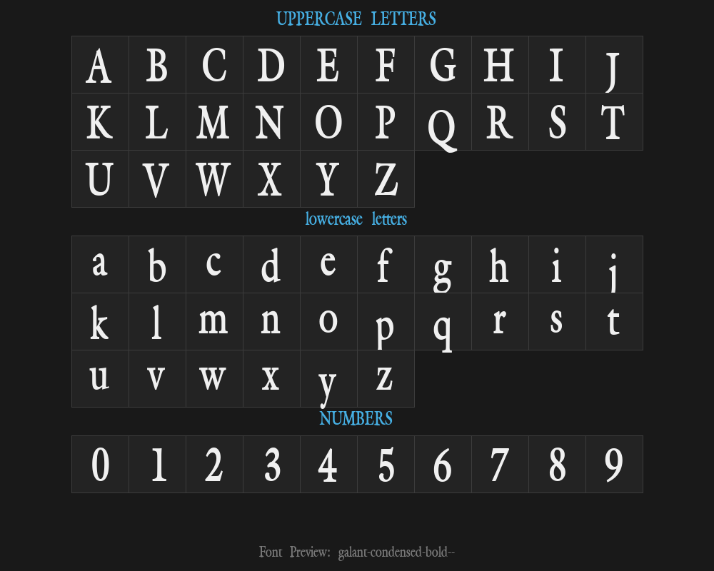 galant-condensed-bold-1- is a font file with a size of 0.06 MB. The full font name is Galant-Condensed Bold, 1.0 1995 2.0 2001 version. It contains 216 characters, supports 8 Chinese characters. The copyright belongs to Galant-Condensed. galant-condensed-bold-1- font is available for free download, but commercial use requires confirmation on the Galant-Condensed official website whether it's free for commercial use.