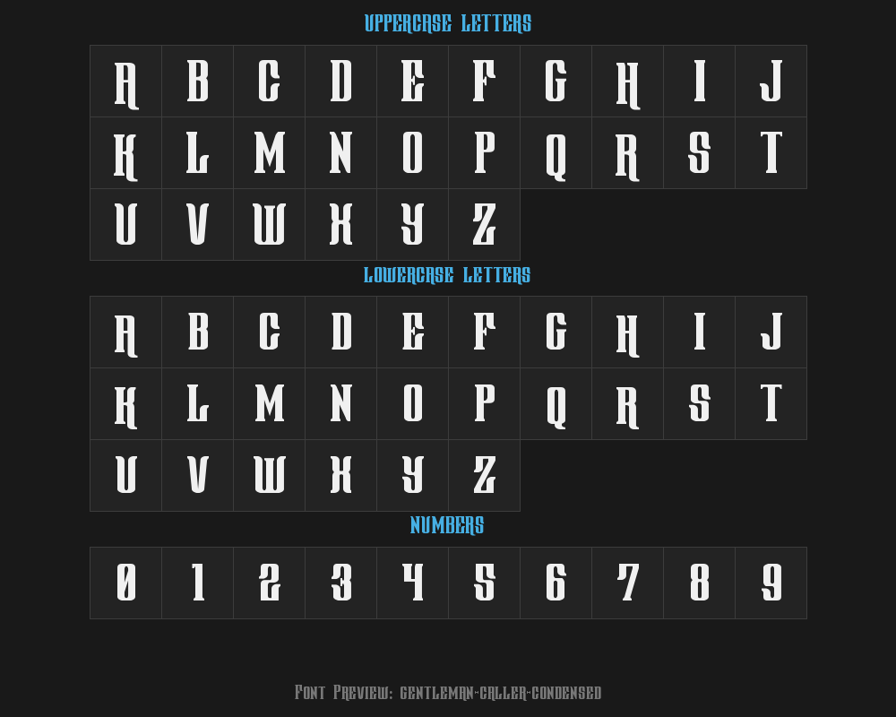 gentleman-caller-condensed is a font file with a size of 0.04 MB. The full font name is Gentleman Caller Condensed, Version 1.0; 2014 version. It contains 222 characters, supports 8 Chinese characters. The copyright belongs to Gentleman Caller Condensed. gentleman-caller-condensed font is available for free download, but commercial use requires confirmation on the Gentleman Caller Condensed official website whether it's free for commercial use.
