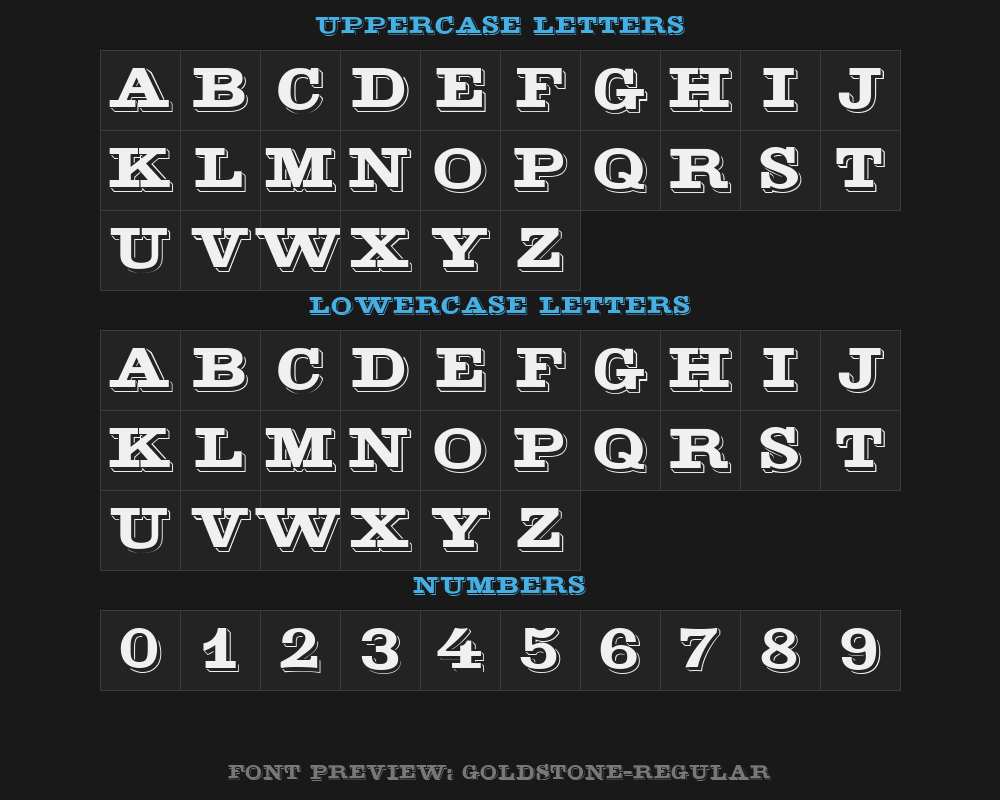 goldstone-regular is a font file with a size of 0.06 MB. The full font name is Goldstone Regular, Publisher's Paradise -- Media Graphics International Inc. version. It contains 227 characters, supports 8 Chinese characters. The copyright belongs to Goldstone. goldstone-regular font is available for free download, but commercial use requires confirmation on the Goldstone official website whether it's free for commercial use.