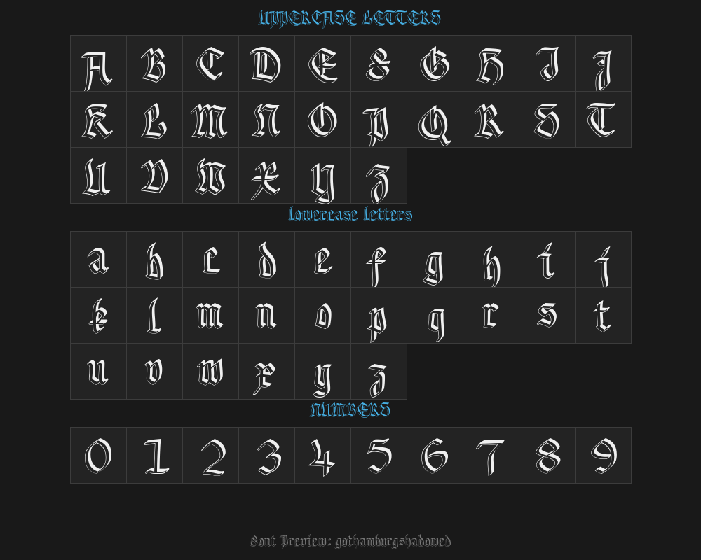 gothamburgshadowed is a font file with a size of 0.07 MB. The full font name is GothamburgShadowed, Macromedia Fontographer 4.1.3 5 24 99 version. It contains 226 characters, supports 8 Chinese characters. The copyright belongs to GothamburgShadowed. gothamburgshadowed font is available for free download, but commercial use requires confirmation on the GothamburgShadowed official website whether it's free for commercial use.