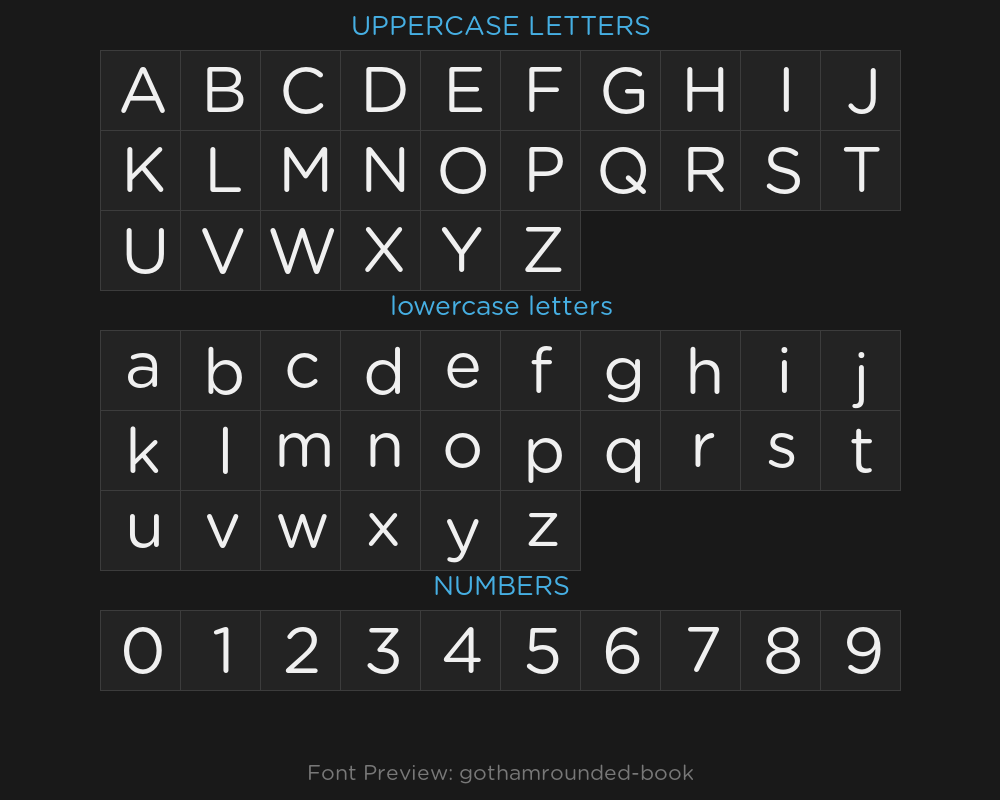 gothamrounded-book is a font file with a size of 0.12 MB. The full font name is GothamRounded-Book, Version 1.002 version. It contains 339 characters, supports 8 Chinese characters. The copyright belongs to Gotham Rounded Book. gothamrounded-book font is available for free download, but commercial use requires confirmation on the Gotham Rounded Book official website whether it's free for commercial use.