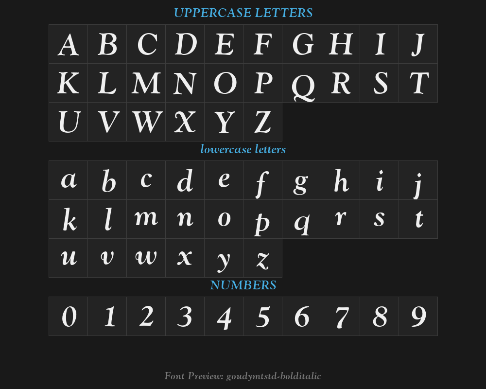goudymtstd-bolditalic is a font file with a size of 0.05 MB. The full font name is GoudyMTStd-BoldItalic, Version 1.006;PS 001.003;Core 1.0.38;makeotf.lib1.6.5960 version. It contains 252 characters, supports 8 Chinese characters. The copyright belongs to Goudy MT Std Bold. goudymtstd-bolditalic font is available for free download, but commercial use requires confirmation on the Goudy MT Std Bold official website whether it's free for commercial use.