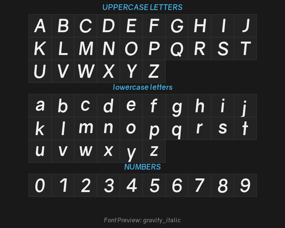 gravity_italic is a font file with a size of 0.06 MB. The full font name is Gravity Bold Italic, Version 1.000;PS 002.000;hotconv 1.0.70;makeotf.lib2.5.58329 version. It contains 501 characters, supports 8 Chinese characters. The copyright belongs to Gravity Italic. gravity_italic font is available for free download, but commercial use requires confirmation on the Gravity Italic official website whether it's free for commercial use.