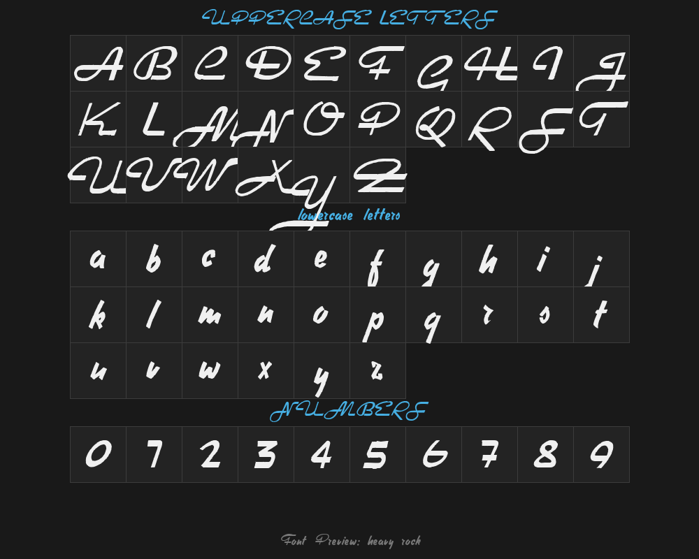 heavy-rock is a font file with a size of 0.07 MB. The full font name is Heavy Rock, Version 1.000 2013 initial release version. It contains 70 characters, supports 8 Chinese characters. The copyright belongs to Heavy Rock. heavy-rock font is available for free download, but commercial use requires confirmation on the Heavy Rock official website whether it's free for commercial use.