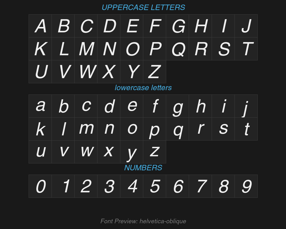 helvetica-oblique is a font file with a size of 0.02 MB. The full font name is Helvetica-Oblique, 001.006 version. It contains 228 characters, supports 8 Chinese characters. The copyright belongs to Helvetica. helvetica-oblique font is available for free download, but commercial use requires confirmation on the Helvetica official website whether it's free for commercial use.