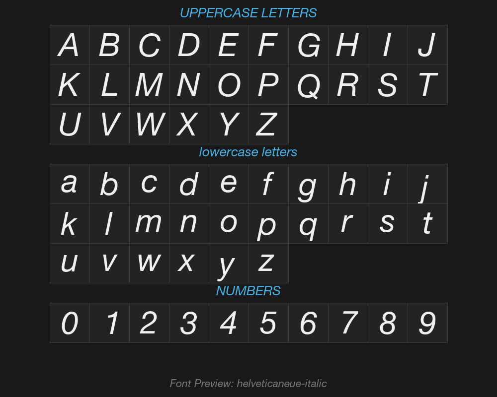 helveticaneue-italic is a font file with a size of 0.02 MB. The full font name is HelveticaNeue-Italic, 001.101 version. It contains 228 characters, supports 8 Chinese characters. The copyright belongs to Helvetica Neue. helveticaneue-italic font is available for free download, but commercial use requires confirmation on the Helvetica Neue official website whether it's free for commercial use.