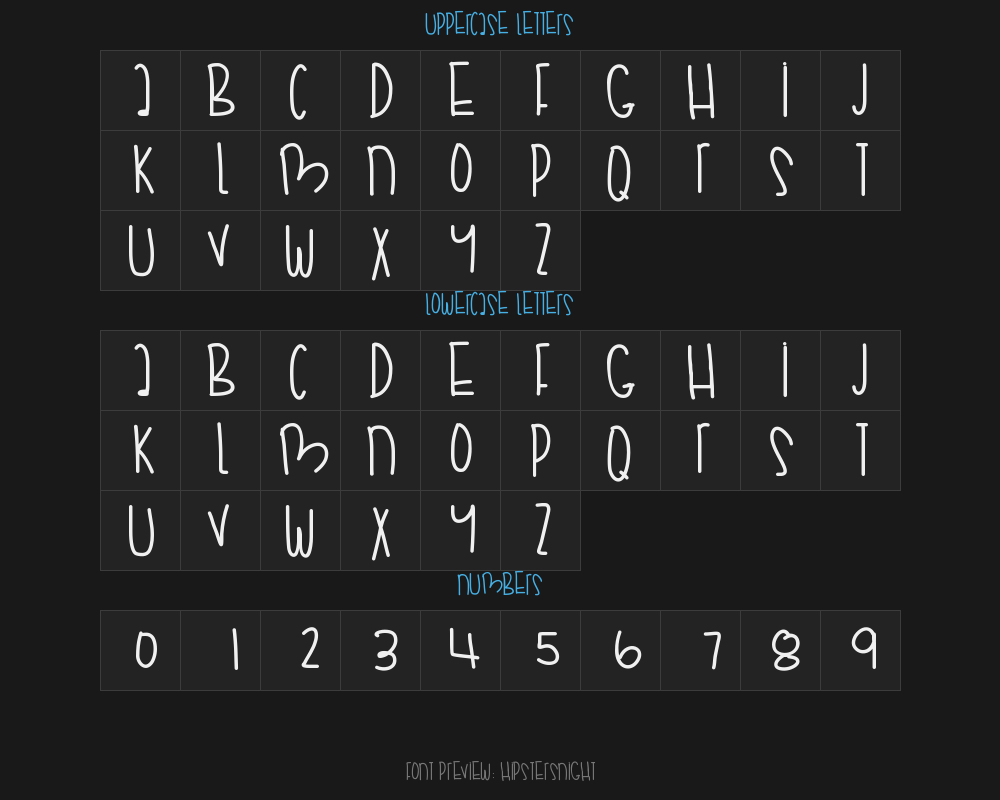 hipstersnight is a font file with a size of 0.02 MB. The full font name is HipstersNight, Version 001.000 version. It contains 100 characters, supports 8 Chinese characters. The copyright belongs to HipstersNight. hipstersnight font is available for free download, but commercial use requires confirmation on the HipstersNight official website whether it's free for commercial use.