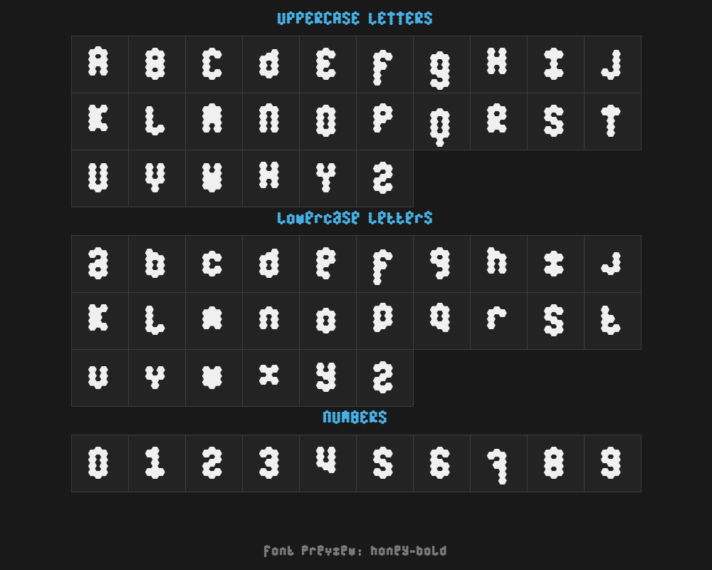 honey-bold is a font file with a size of 0.04 MB. The full font name is honey Bold, Macromedia Fontographer 4.1.2 07.12.1998 version. It contains 115 characters, supports 8 Chinese characters. The copyright belongs to honey. honey-bold font is available for free download, but commercial use requires confirmation on the honey official website whether it's free for commercial use.