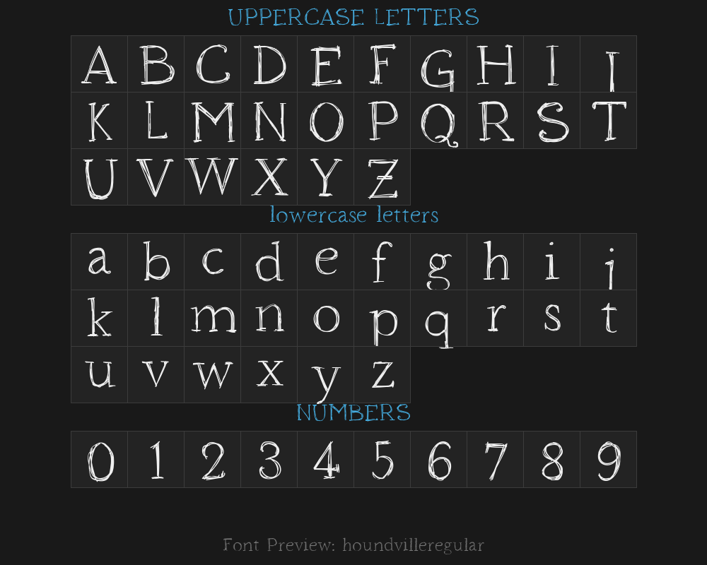 houndvilleregular is a font file with a size of 0.16 MB. The full font name is HoundvilleRegular, Version 1.001;Fontself Maker 1.0.7 version. It contains 164 characters, supports 8 Chinese characters. The copyright belongs to Houndville. houndvilleregular font is available for free download, but commercial use requires confirmation on the Houndville official website whether it's free for commercial use.