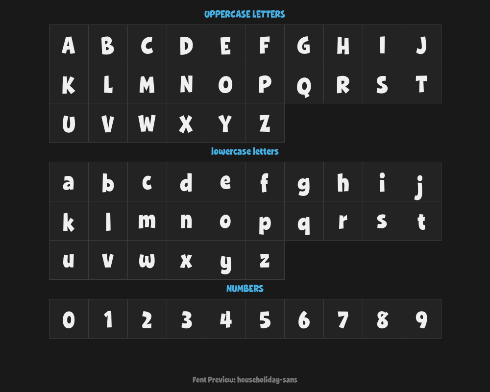 householiday-sans is a font file with a size of 0.05 MB. The full font name is HouseHoliday-Sans, Version 1.000;PS 001.001;hotconv 1.0.38 version. It contains 330 characters, supports 8 Chinese characters. The copyright belongs to House Holiday Sans. householiday-sans font is available for free download, but commercial use requires confirmation on the House Holiday Sans official website whether it's free for commercial use.