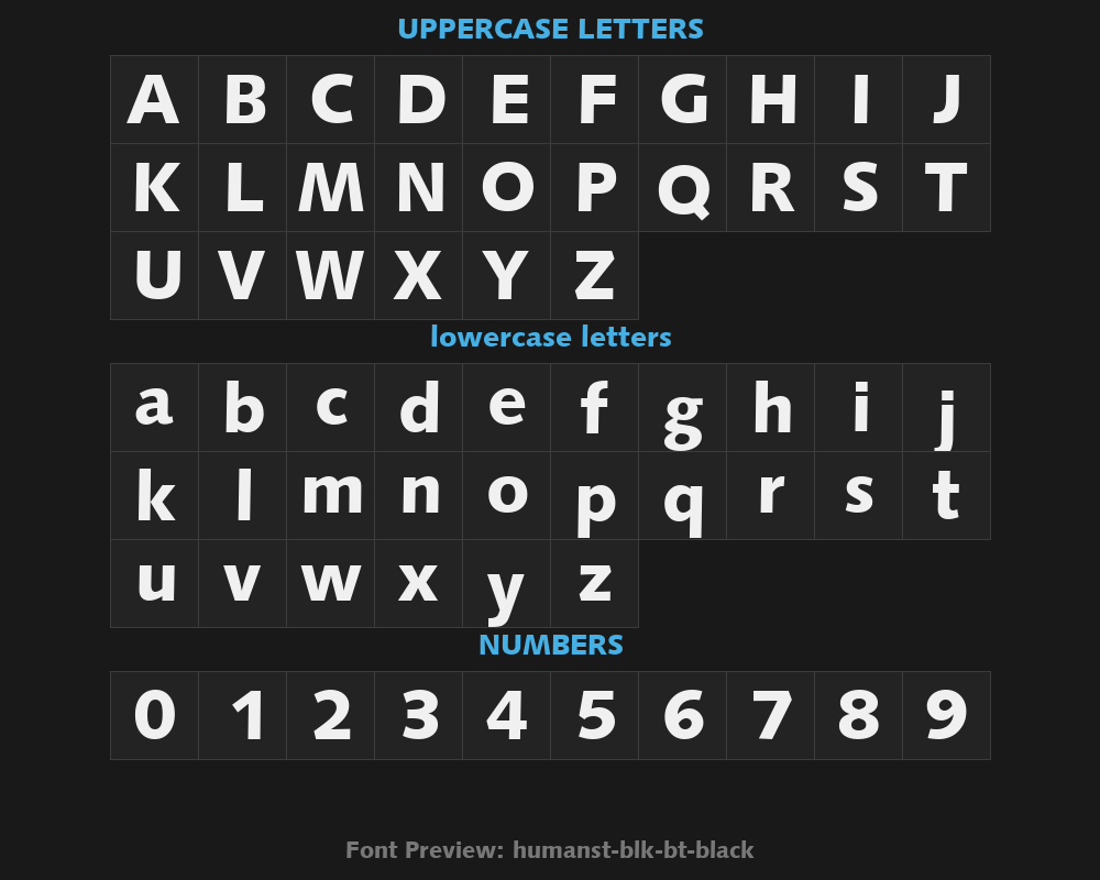 humanst531-blk-bt-black is a font file with a size of 0.04 MB. The full font name is Humanst531 Blk BT Black, mfgpctt-v4.4 Dec 22 1998 version. It contains 259 characters, supports 8 Chinese characters. The copyright belongs to Humanst531 Blk BT. humanst531-blk-bt-black font is available for free download, but commercial use requires confirmation on the Humanst531 Blk BT official website whether it's free for commercial use.