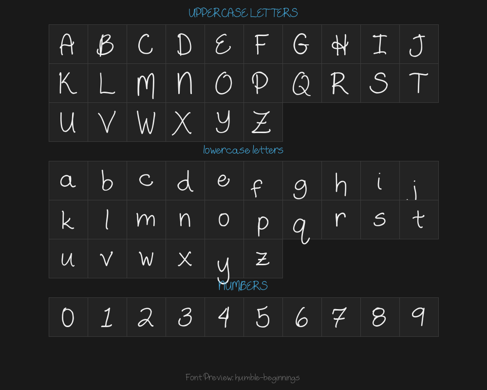 humble-beginnings is a font file with a size of 0.06 MB. The full font name is Humble Beginnings, Version 1.000 version. It contains 223 characters, supports 8 Chinese characters. The copyright belongs to Humble Beginnings. humble-beginnings font is available for free download, but commercial use requires confirmation on the Humble Beginnings official website whether it's free for commercial use.