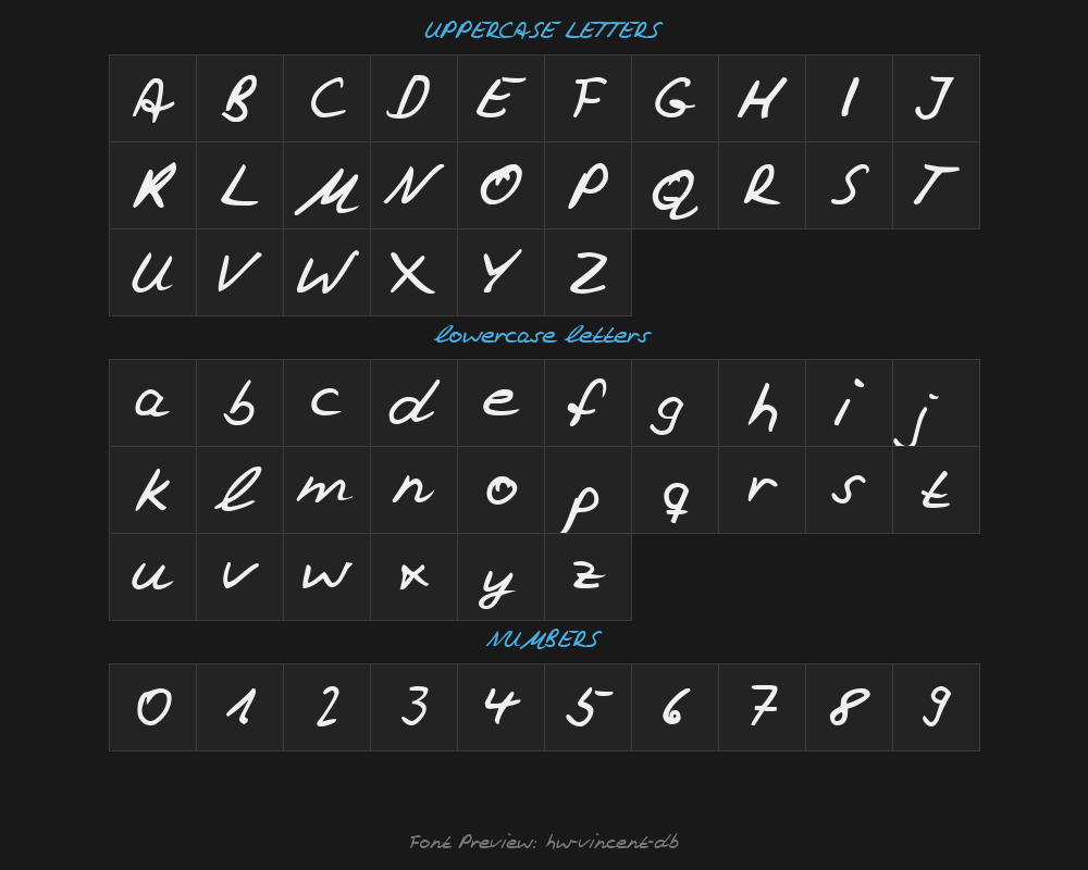 hw-vincent-db is a font file with a size of 0.05 MB. The full font name is HW Vincent DB, 1.0 Wed Apr 02 10 29 28 1997 version. It contains 192 characters, supports 8 Chinese characters. The copyright belongs to HW Vincent DB. hw-vincent-db font is available for free download, but commercial use requires confirmation on the HW Vincent DB official website whether it's free for commercial use.