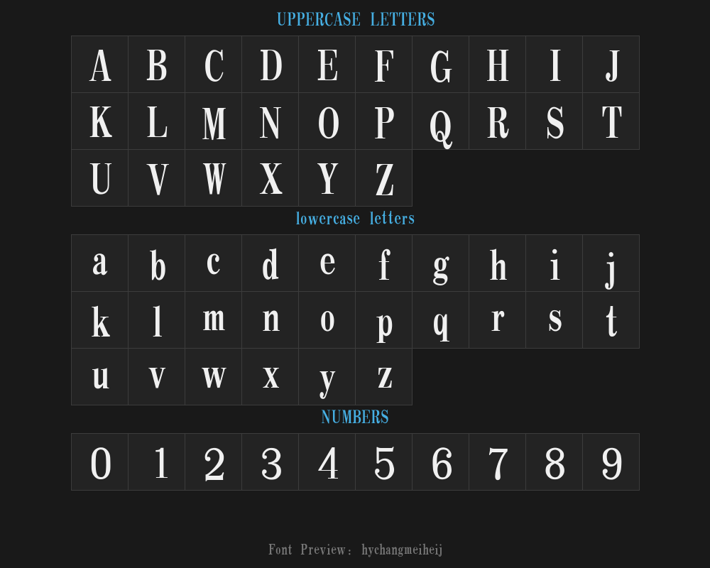 hychangmeiheij is a font file with a size of 2.48 MB. The full font name is HYChangMeiHeiJ, Version 3.53 version. It contains 7615 characters, supports 6763 Chinese characters. The copyright belongs to Han Yi is long and beautiful with a black scroll. hychangmeiheij font is available for free download, but commercial use requires confirmation on the Han Yi is long and beautiful with a black scroll official website whether it's free for commercial use.