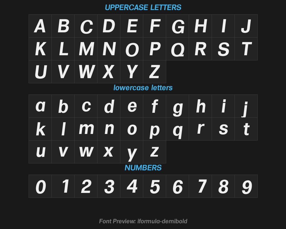iformula-demibold is a font file with a size of 0.03 MB. The full font name is Iformula-DemiBold, 001.000 version. It contains 200 characters, supports 8 Chinese characters. The copyright belongs to Iformula DemiBold. iformula-demibold font is available for free download, but commercial use requires confirmation on the Iformula DemiBold official website whether it's free for commercial use.