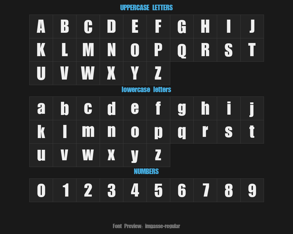 impasse-regular is a font file with a size of 0.04 MB. The full font name is Impasse-Regular, 1.0 Fri Nov 03 09 12 19 1995 version. It contains 187 characters, supports 8 Chinese characters. The copyright belongs to Impasse. impasse-regular font is available for free download, but commercial use requires confirmation on the Impasse official website whether it's free for commercial use.