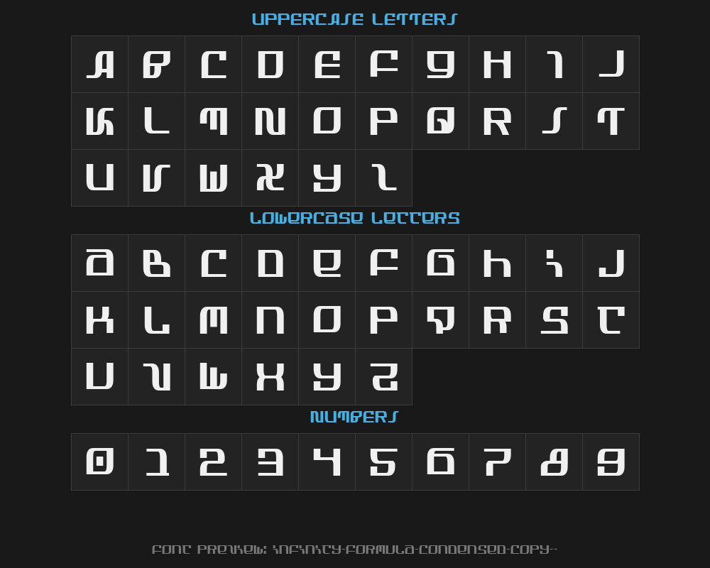infinity-formula-condensed-copy-1- is a font file with a size of 0.05 MB. The full font name is Infinity Formula Condensed, 1 version. It contains 218 characters, supports 8 Chinese characters. The copyright belongs to Infinity Formula Condensed. infinity-formula-condensed-copy-1- font is available for free download, but commercial use requires confirmation on the Infinity Formula Condensed official website whether it's free for commercial use.