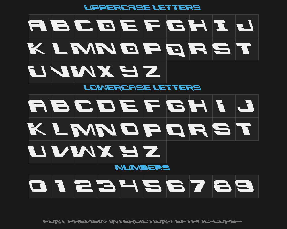 interdiction-leftalic-copy-1- is a font file with a size of 0.05 MB. The full font name is Interdiction Leftalic, Version 1.0; 2012 version. It contains 219 characters, supports 8 Chinese characters. The copyright belongs to Interdiction Leftalic. interdiction-leftalic-copy-1- font is available for free download, but commercial use requires confirmation on the Interdiction Leftalic official website whether it's free for commercial use.