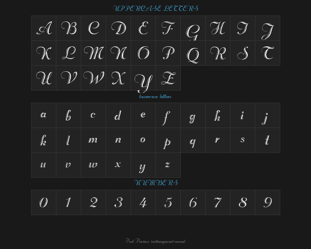 inviteengraved-normal is a font file with a size of 0.08 MB. The full font name is InviteEngraved Normal, 1.0 1995 2.0 2001 version. It contains 221 characters, supports 8 Chinese characters. The copyright belongs to InviteEngraved. inviteengraved-normal font is available for free download, but commercial use requires confirmation on the InviteEngraved official website whether it's free for commercial use.