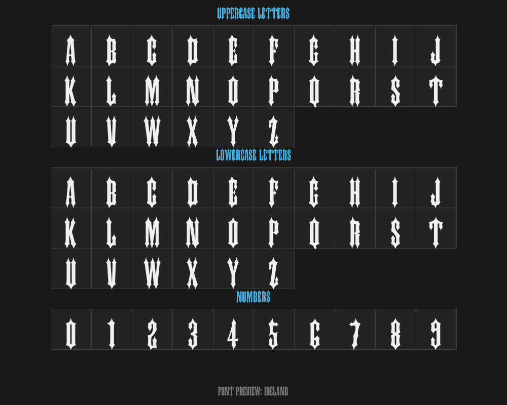 ireland is a font file with a size of 0.05 MB. The full font name is Ireland, 1.0 version. It contains 187 characters, supports 8 Chinese characters. The copyright belongs to Ireland. ireland font is available for free download, but commercial use requires confirmation on the Ireland official website whether it's free for commercial use.
