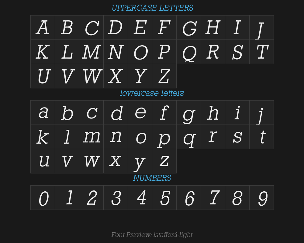 istafford-light is a font file with a size of 0.03 MB. The full font name is Istafford-Light, 001.000 version. It contains 200 characters, supports 8 Chinese characters. The copyright belongs to Istafford Light. istafford-light font is available for free download, but commercial use requires confirmation on the Istafford Light official website whether it's free for commercial use.