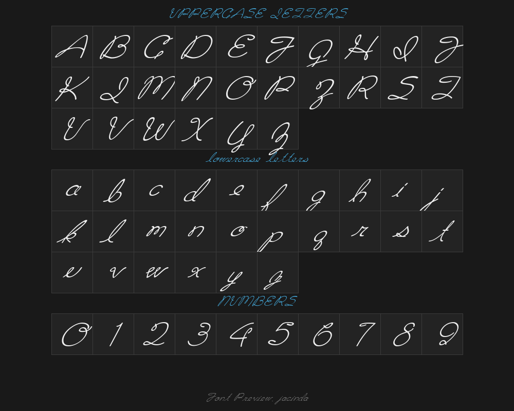 jacinda is a font file with a size of 0.07 MB. The full font name is Jacinda, 1.0 version. It contains 252 characters, supports 8 Chinese characters. The copyright belongs to Jacinda. jacinda font is available for free download, but commercial use requires confirmation on the Jacinda official website whether it's free for commercial use.