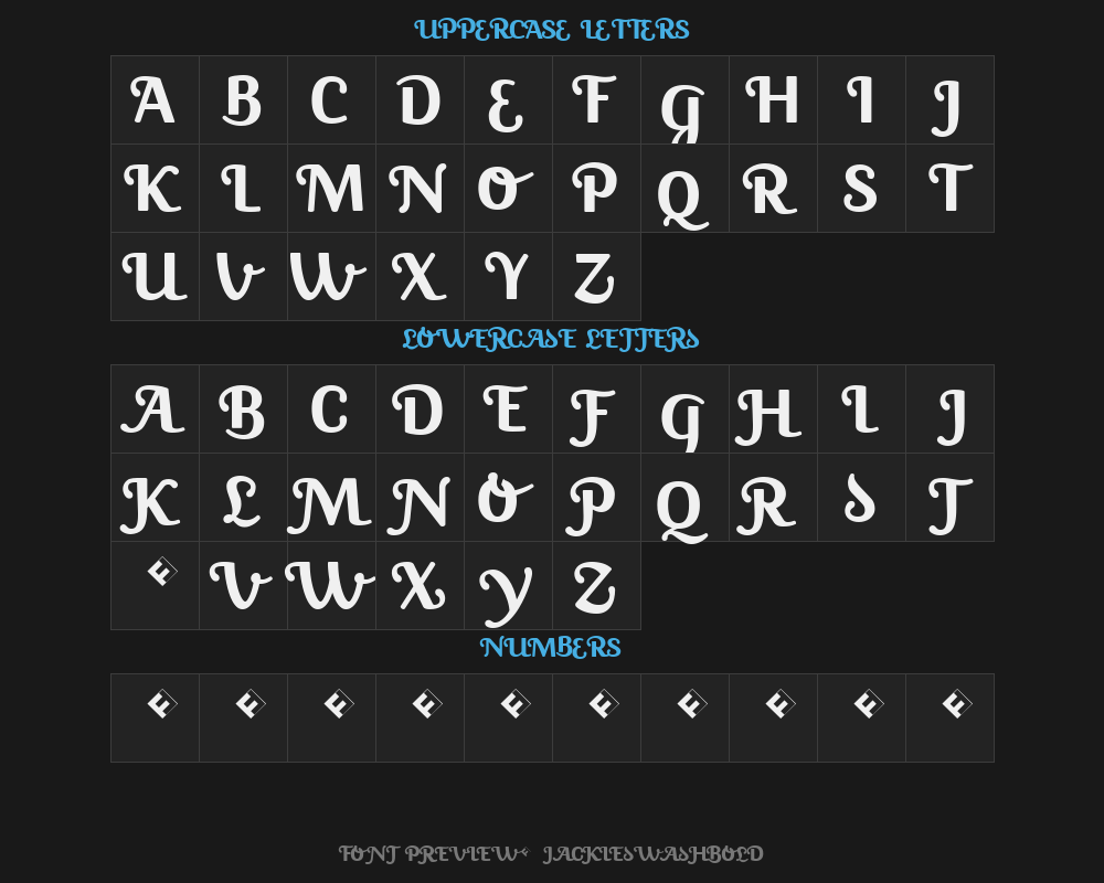 jackieswashbold is a font file with a size of 0.06 MB. The full font name is JackieSwashBold, 004.460 version. It contains 232 characters, supports 8 Chinese characters. The copyright belongs to JackieSwashBold. jackieswashbold font is available for free download, but commercial use requires confirmation on the JackieSwashBold official website whether it's free for commercial use.