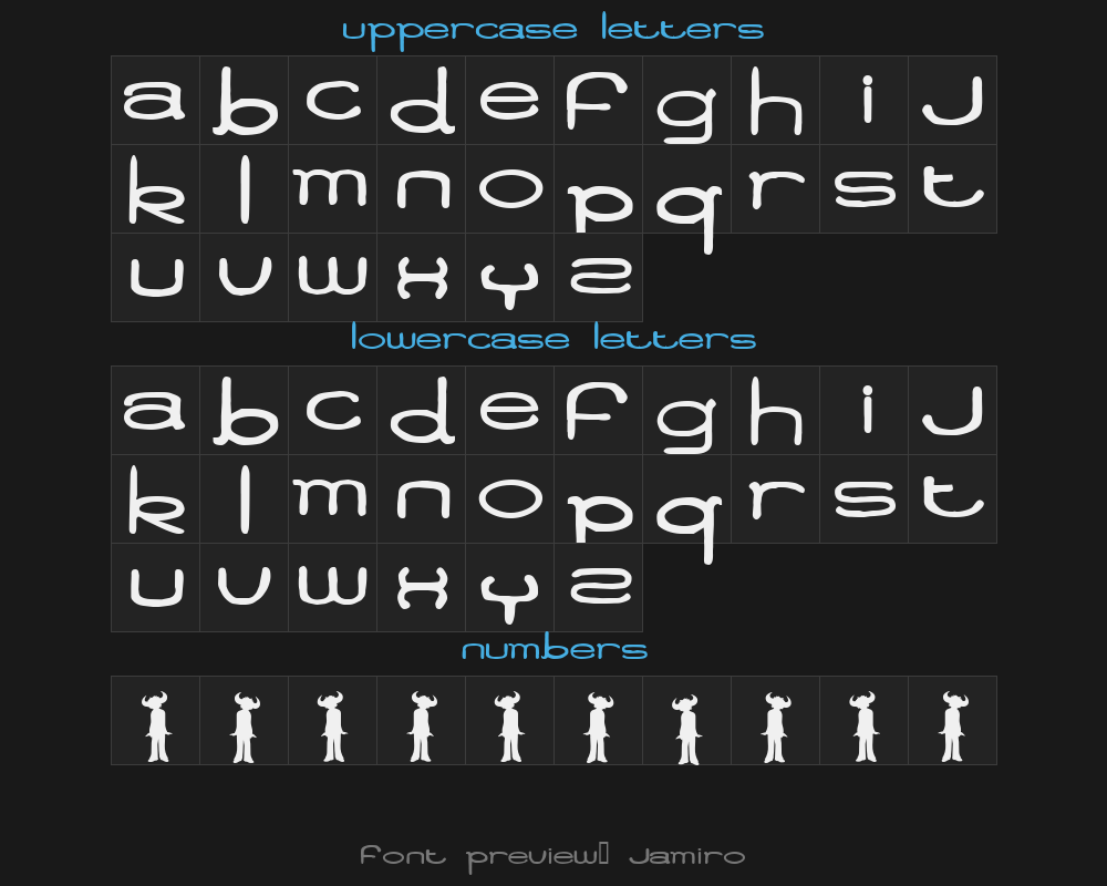 jamiro is a font file with a size of 0.03 MB. The full font name is Jamiro, 1.0 Fri May 23 22 33 30 1997 version. It contains 71 characters, supports 8 Chinese characters. The copyright belongs to Jamiro. jamiro font is available for free download, but commercial use requires confirmation on the Jamiro official website whether it's free for commercial use.