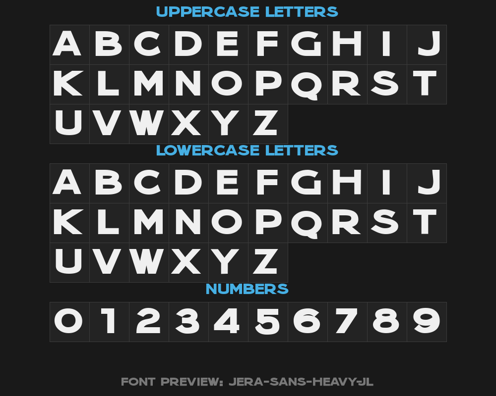 jera-sans-heavy-jl is a font file with a size of 0.03 MB. The full font name is Jera Sans Heavy JL, Version 1.0 version. It contains 132 characters, supports 8 Chinese characters. The copyright belongs to Jera Sans Heavy JL. jera-sans-heavy-jl font is available for free download, but commercial use requires confirmation on the Jera Sans Heavy JL official website whether it's free for commercial use.