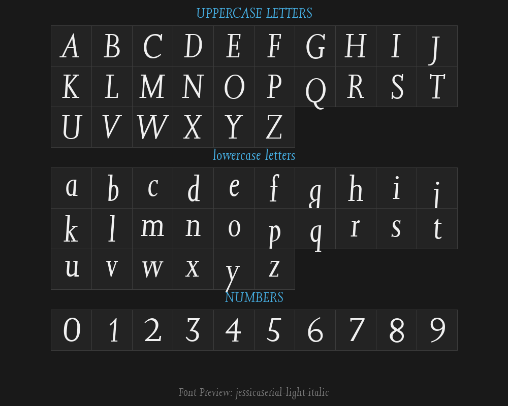 jessicaserial-light-italic is a font file with a size of 0.06 MB. The full font name is JessicaSerial-Light-Italic, Version 1.0 27-08-2002 version. It contains 251 characters, supports 8 Chinese characters. The copyright belongs to JessicaSerial-Light. jessicaserial-light-italic font is available for free download, but commercial use requires confirmation on the JessicaSerial-Light official website whether it's free for commercial use.