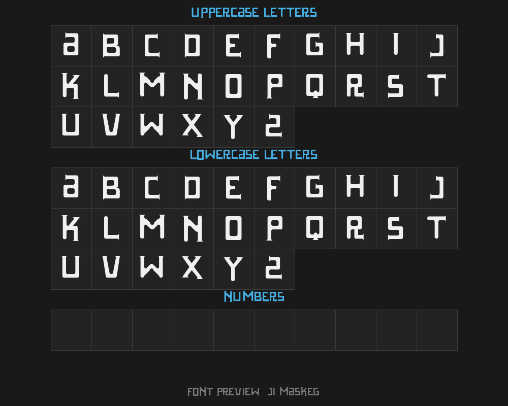 ji-maskeg is a font file with a size of 0.02 MB. The full font name is JI-Maskeg, Macromedia Fontographer 4.1 8 14 2001 version. It contains 96 characters, supports 8 Chinese characters. The copyright belongs to JI-Maskeg. ji-maskeg font is available for free download, but commercial use requires confirmation on the JI-Maskeg official website whether it's free for commercial use.