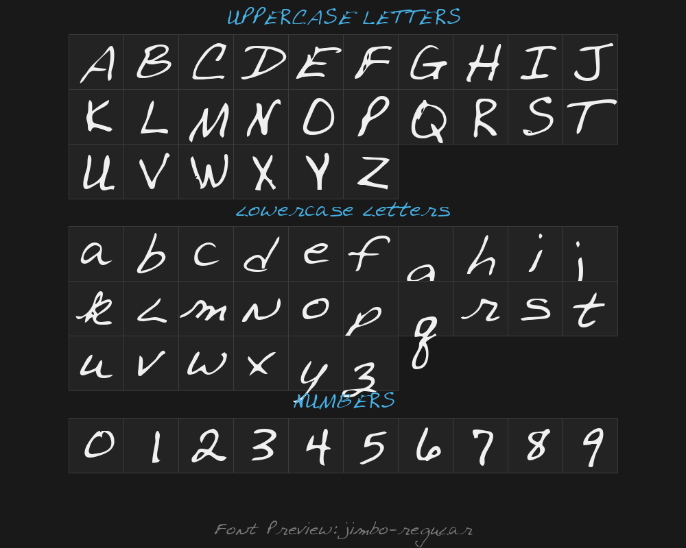 jimbo-regular is a font file with a size of 0.03 MB. The full font name is Jimbo Regular, Altsys Metamorphosis 3 2 95 version. It contains 108 characters, supports 8 Chinese characters. The copyright belongs to Jimbo. jimbo-regular font is available for free download, but commercial use requires confirmation on the Jimbo official website whether it's free for commercial use.