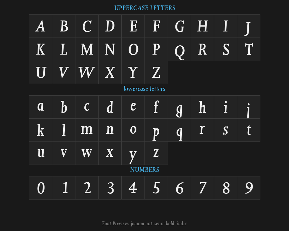 | PostScript name | JoannaMT-SemiBoldItalic |