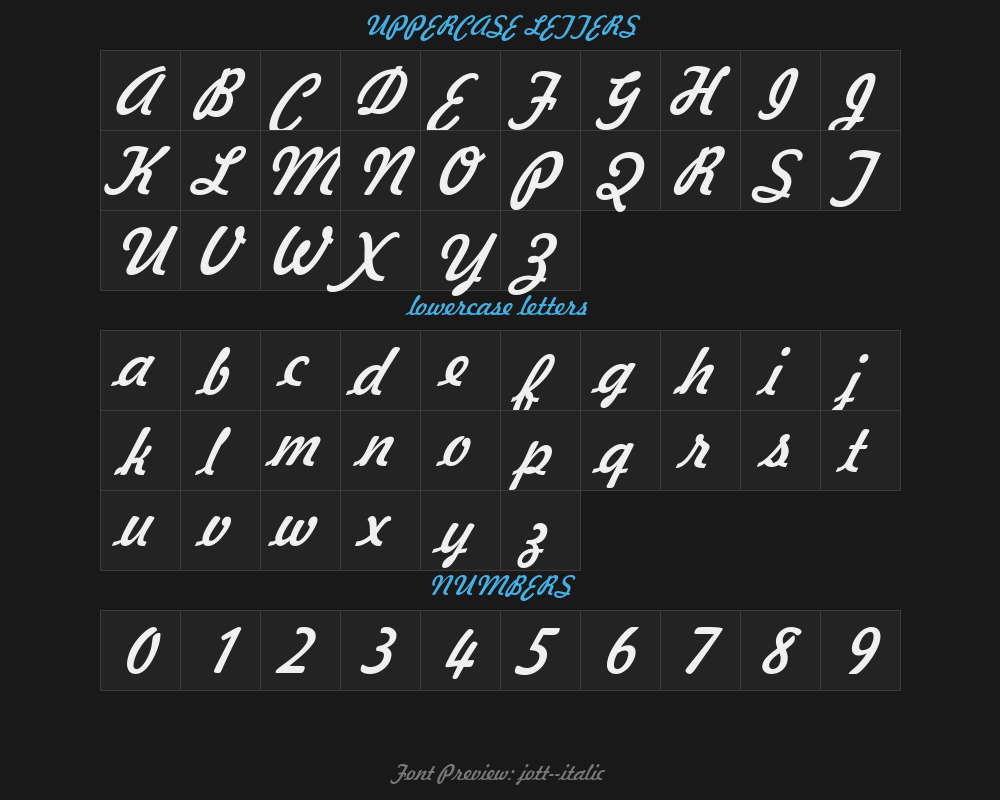 jott-43-italic is a font file with a size of 0.07 MB. The full font name is Jott 43 Italic, Altsys Fontographer 4.1 12 22 94 version. It contains 225 characters, supports 8 Chinese characters. The copyright belongs to Jott 43. jott-43-italic font is available for free download, but commercial use requires confirmation on the Jott 43 official website whether it's free for commercial use.