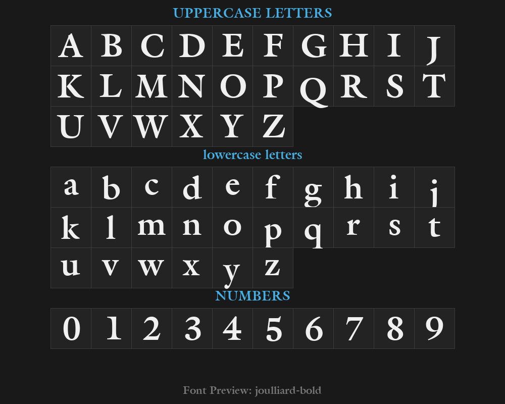 joulliard-bold is a font file with a size of 0.06 MB. The full font name is Joulliard Bold, Rev. 002.02q version. It contains 231 characters, supports 8 Chinese characters. The copyright belongs to Joulliard. joulliard-bold font is available for free download, but commercial use requires confirmation on the Joulliard official website whether it's free for commercial use.