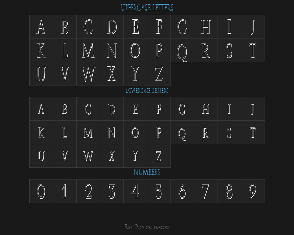 jw-brass is a font file with a size of 0.09 MB. The full font name is JW Brass, 1.28 Sun Mar 01 12 19 57 1998 version. It contains 146 characters, supports 8 Chinese characters. The copyright belongs to JW Brass. jw-brass font is available for free download, but commercial use requires confirmation on the JW Brass official website whether it's free for commercial use.