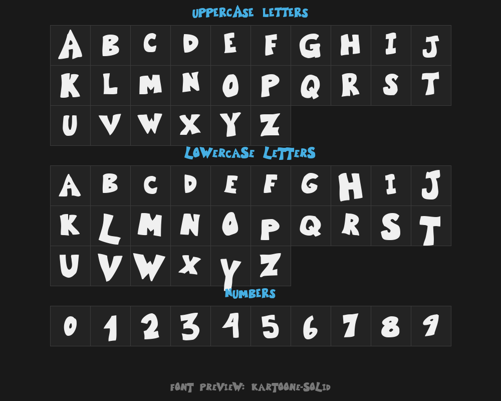 kartoone-solid is a font file with a size of 0.03 MB. The full font name is Kartoone Solid, 1.0 version. It contains 113 characters, supports 8 Chinese characters. The copyright belongs to Kartoone Solid. kartoone-solid font is available for free download, but commercial use requires confirmation on the Kartoone Solid official website whether it's free for commercial use.