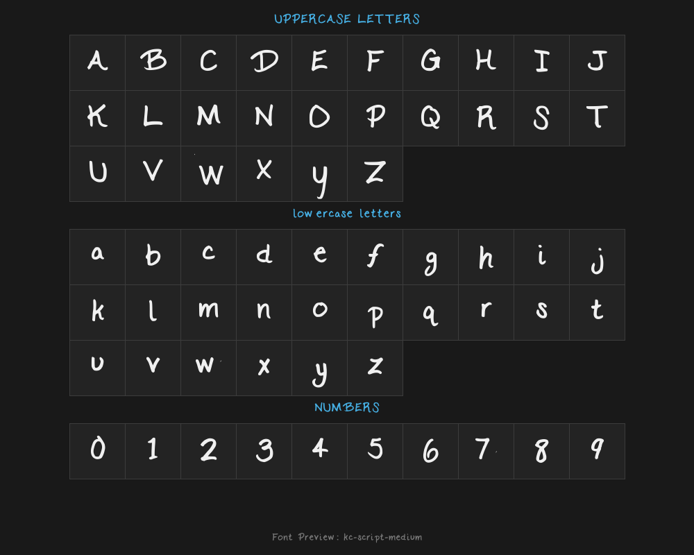 kc-script-medium is a font file with a size of 0.03 MB. The full font name is KC Script Medium, Version 2 version. It contains 150 characters, supports 8 Chinese characters. The copyright belongs to KC Script. kc-script-medium font is available for free download, but commercial use requires confirmation on the KC Script official website whether it's free for commercial use.