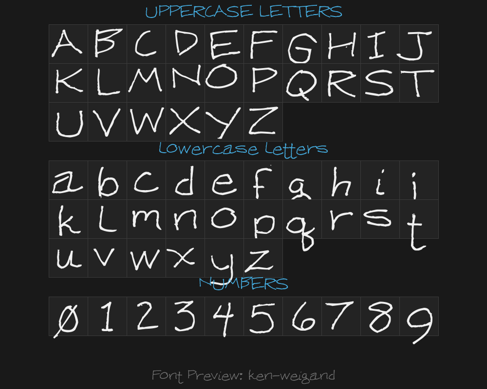 ken-weigand is a font file with a size of 0.03 MB. The full font name is Ken Weigand, Version 1.00 September 1, 2013, initial release, www.yourfonts.com version. It contains 128 characters, supports 8 Chinese characters. The copyright belongs to Ken Weigand. ken-weigand font is available for free download, but commercial use requires confirmation on the Ken Weigand official website whether it's free for commercial use.