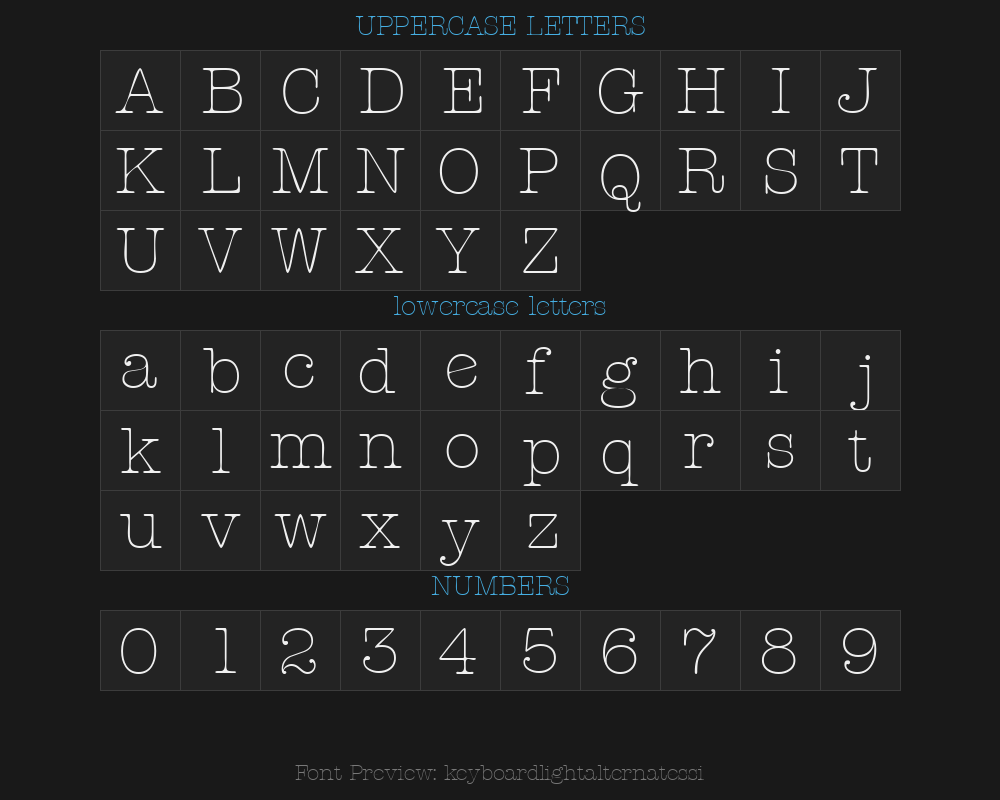 keyboardlightalternatessi is a font file with a size of 0.08 MB. The full font name is KeyboardLightAlternateSSi, Macromedia Fontographer 4.1 8 4 95 version. It contains 252 characters, supports 8 Chinese characters. The copyright belongs to KeyboardLightAlternateSSi. keyboardlightalternatessi font is available for free download, but commercial use requires confirmation on the KeyboardLightAlternateSSi official website whether it's free for commercial use.