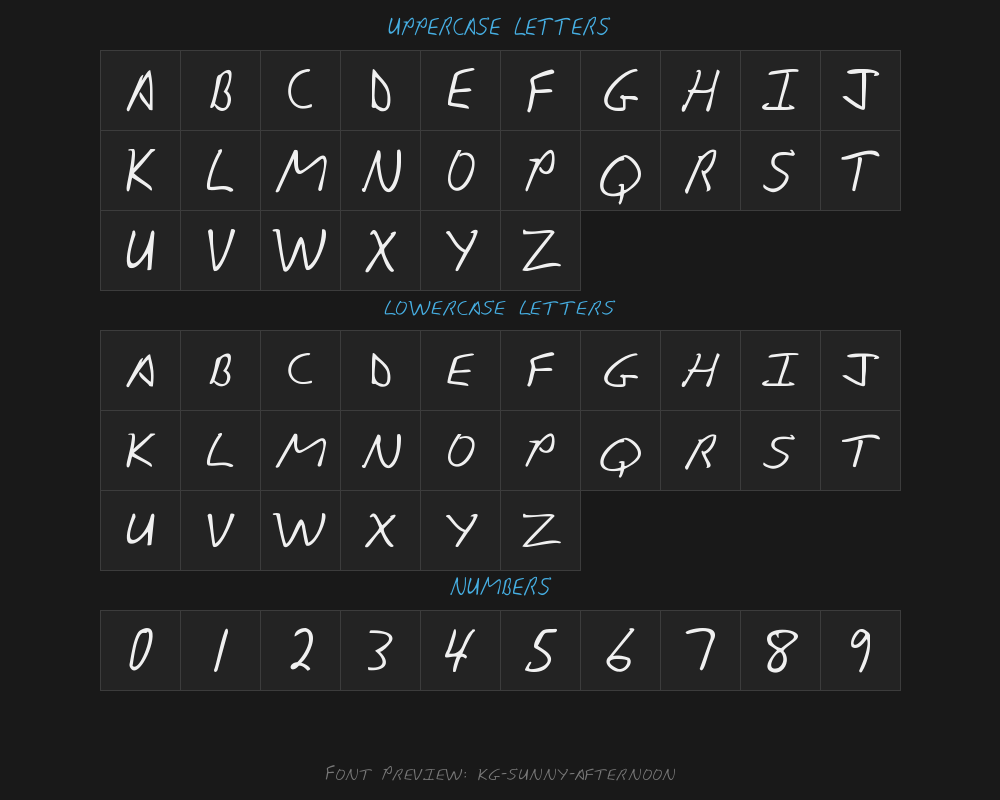 kg-sunny-afternoon is a font file with a size of 0.03 MB. The full font name is KG Sunny Afternoon, Version 1.000 2011 initial release version. It contains 332 characters, supports 8 Chinese characters. The copyright belongs to KG Sunny Afternoon. kg-sunny-afternoon font is available for free download, but commercial use requires confirmation on the KG Sunny Afternoon official website whether it's free for commercial use.