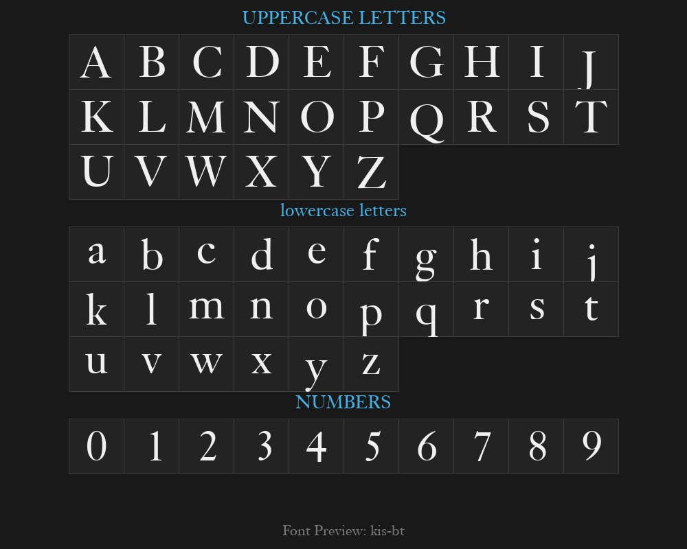 kis-bt is a font file with a size of 0.05 MB. The full font name is Kis BT, mfgpctt-v1.54 Tuesday, February 9, 1993 8 03 28 am (EST) version. It contains 257 characters, supports 8 Chinese characters. The copyright belongs to Kis BT. kis-bt font is available for free download, but commercial use requires confirmation on the Kis BT official website whether it's free for commercial use.